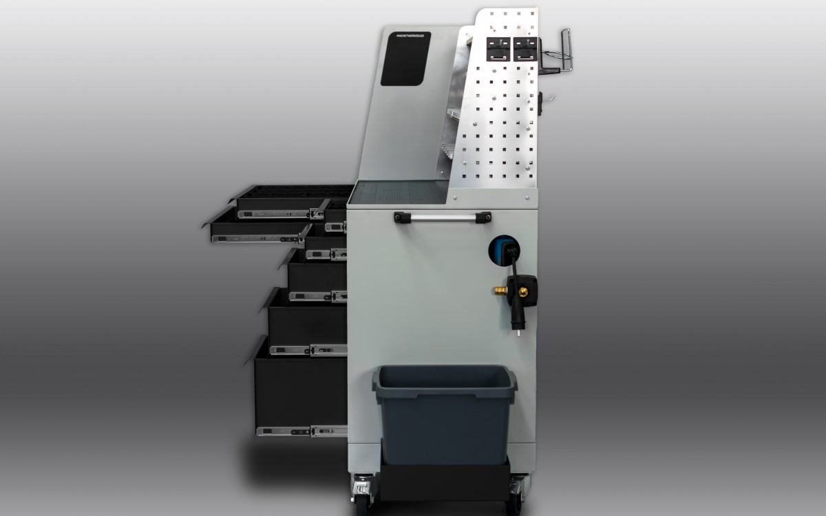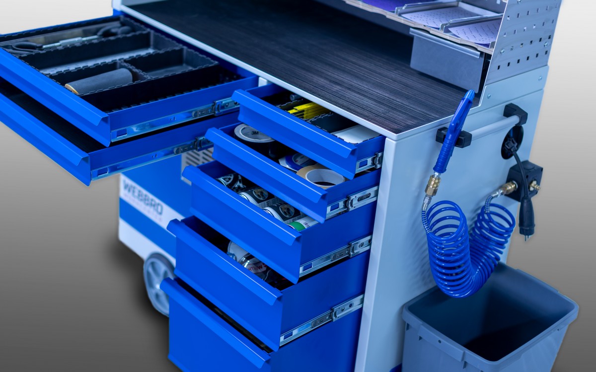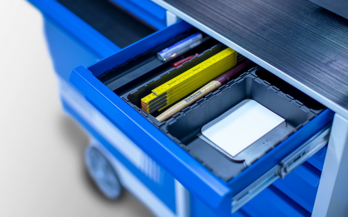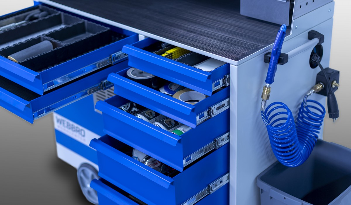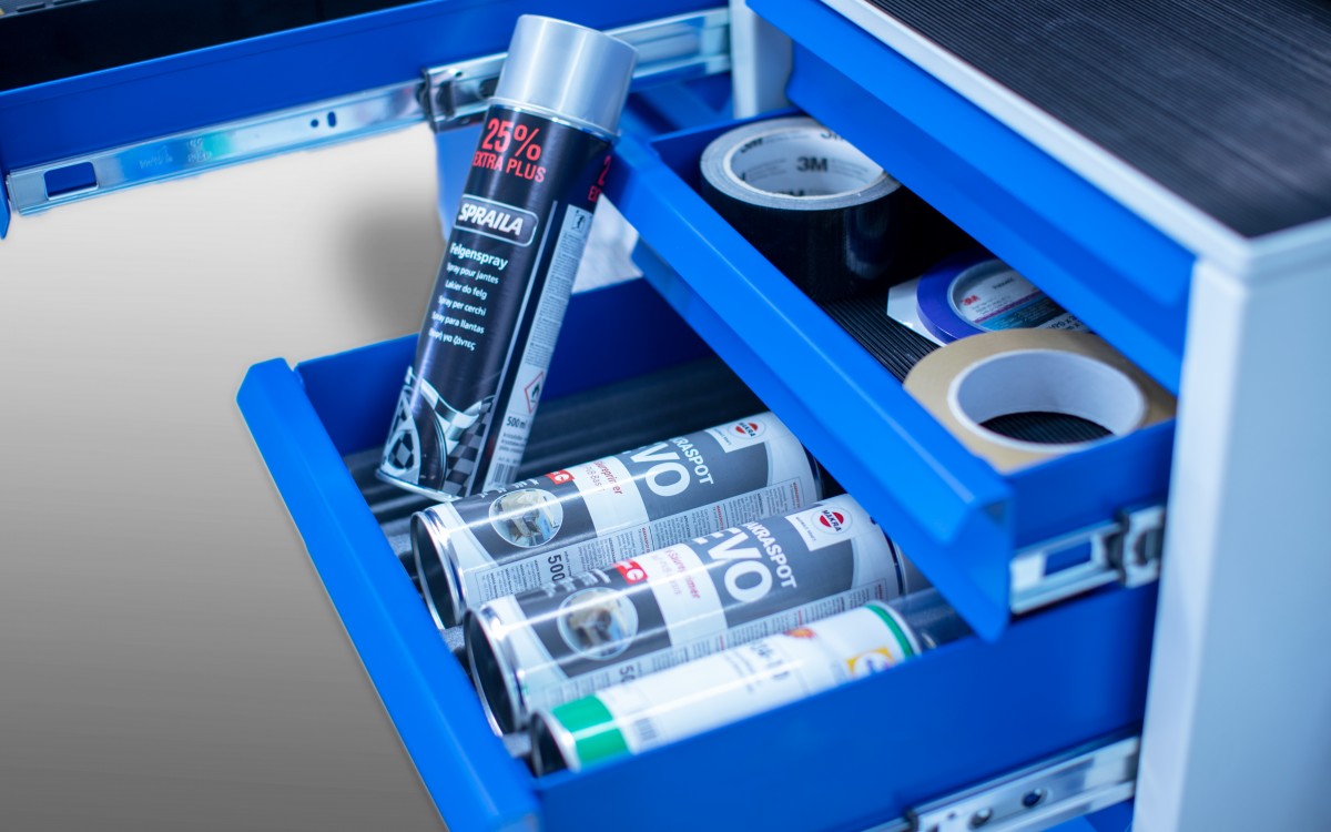 Im Workcenter finden alle für die Instandsetzung und Lackiervorbereitung benötigten Werkzeuge und Materialien ihren Platz. Das Herzstück des Workcenters ist der Abrasive Organizer - ein einzigartiges Ordnungssystem für alle relevanten Schleifmittel inklusive Vorratsspeicher. Jedes Schleifmittel hat hier seinen fixen Platz und ist immer griffbereit und ordentlich aufbewahrt. Dadurch können die Zeiten für den Schleifpapierwechsel und insbesondere der Schleifpapierverbrauch massiv gesenkt werden. In den insgesamt sieben von der Vorderseite aus zugänglichen Schubladen können alle weiteren Werkzeuge und Arbeitsmaterialien im modularen Ordnungssystem von Aqurado untergebracht werden.