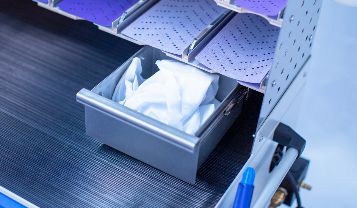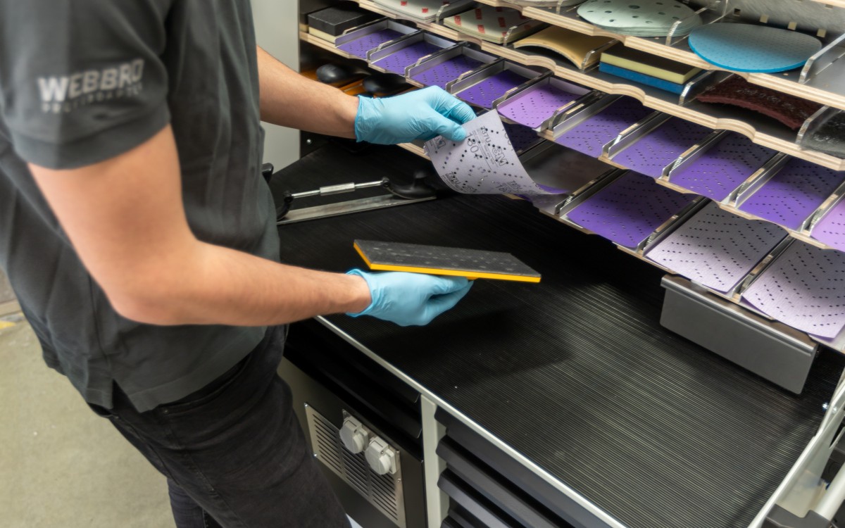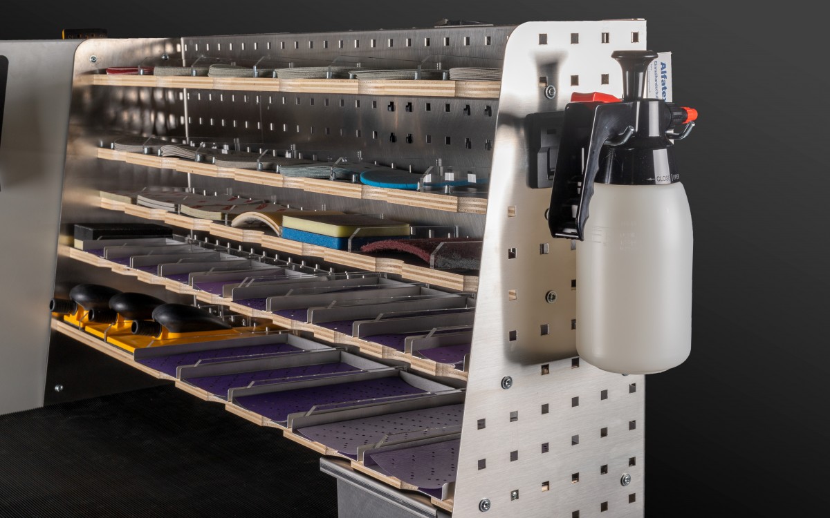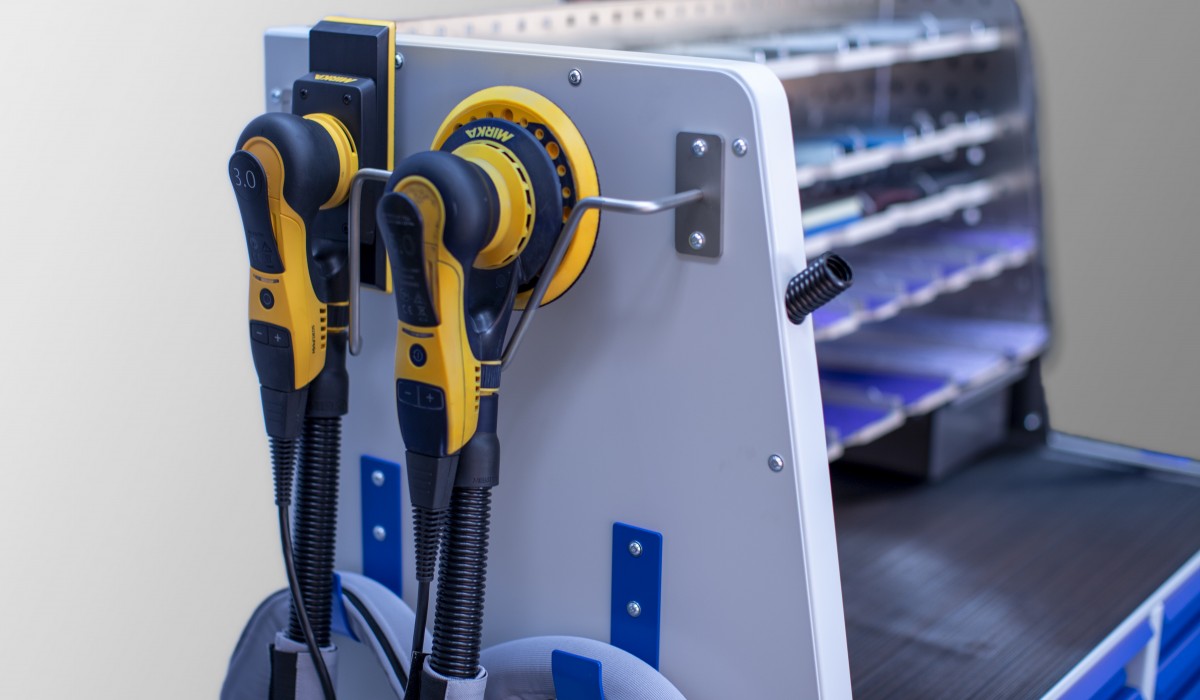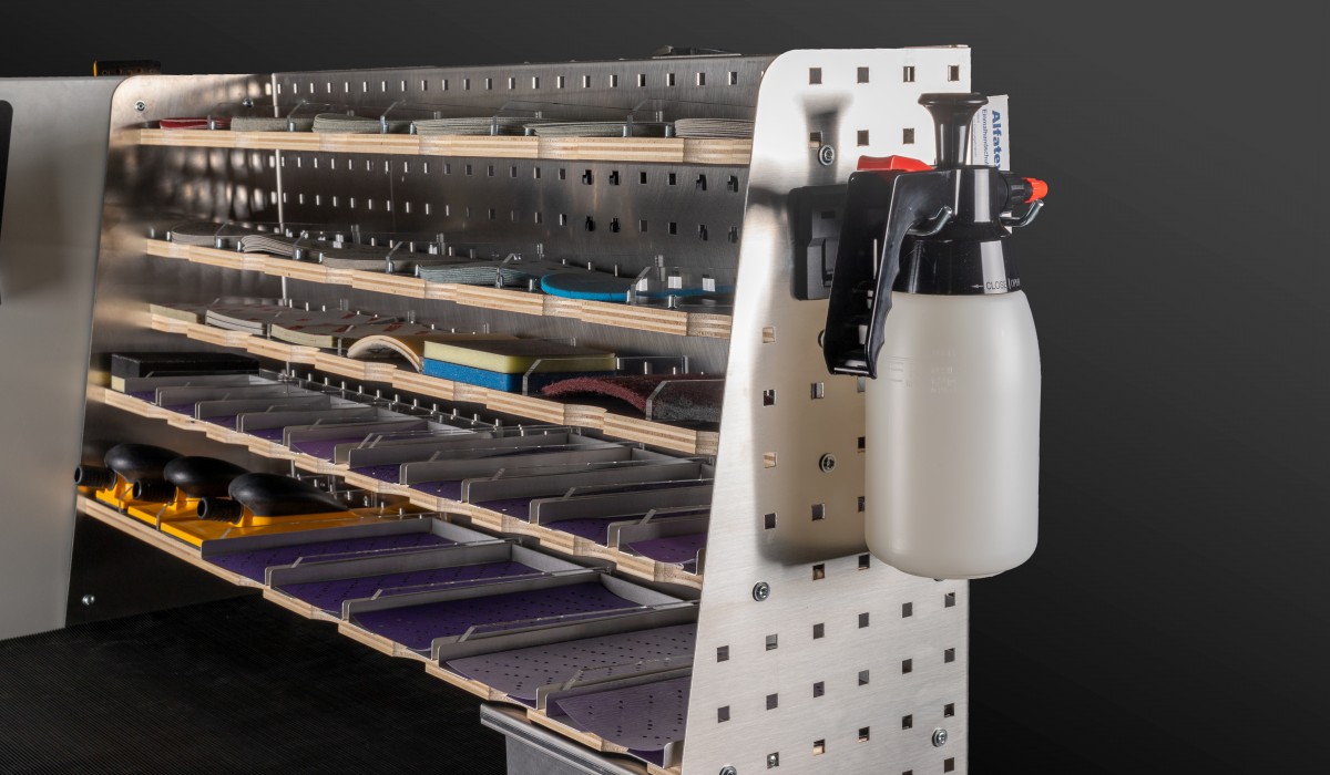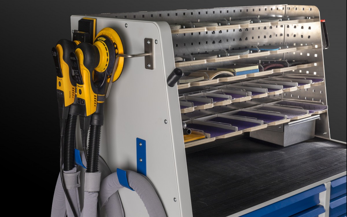 Ein einzigartiges Ordnungssystem für alle relevanten Schleifmittel, inklusive Vorratsspeicher. Von Excenterschleifpapier, über Feilenstreifen drei verschiedener Größen und zugehörigem Schleifklotz bis hin zu verschiedenen Schleifpads. Hier sind wirklich alle Schleifpapiere ordentlich aufbewahrt und immer griffbereit, ohne zu verheddern! Durchschnittlich wird bei einem Lackierauftrag mit Spachtelarbeiten das Schleifpapier bis zu 30x gewechselt. Dieses Ordnungssystem ermöglicht einen einfacheren und schnelleren Schleifpapierwechsel und führt gleichzeitig zu einer erheblichen Reduktion des Schleifpapierverbrauchs.